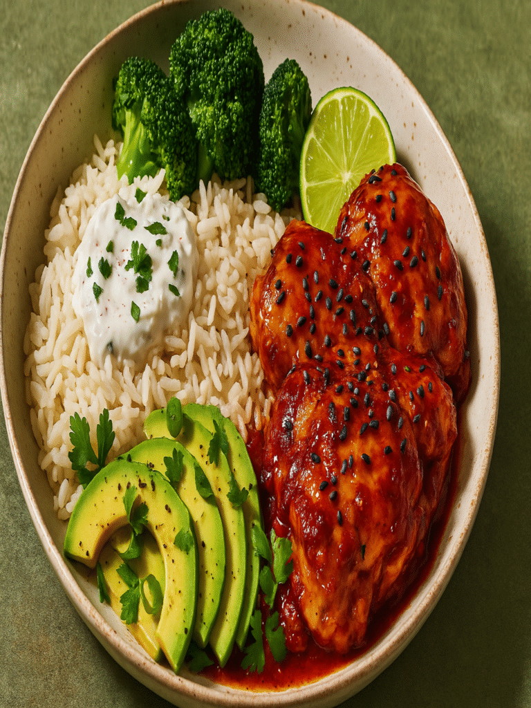 Bliss for your wild side — Sweet and Spicy harissa honey chicken thighs meet golden turmeric rice, sautéed bell peppers and zucchini, and a dollop of cool, creamy tzatziki sauce — a jungle-approved feast that’s heaven in every bite.